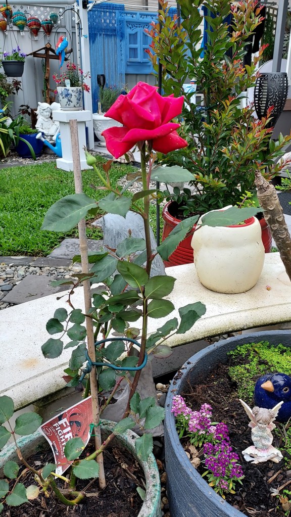 First Bloom – I almost missed it.These bloomers are last years potted plants I transferred to bare patches.Just one full bloom Fire Fighter Red Rose escaped the battering rain. In the front garden there’s another first bloomer.