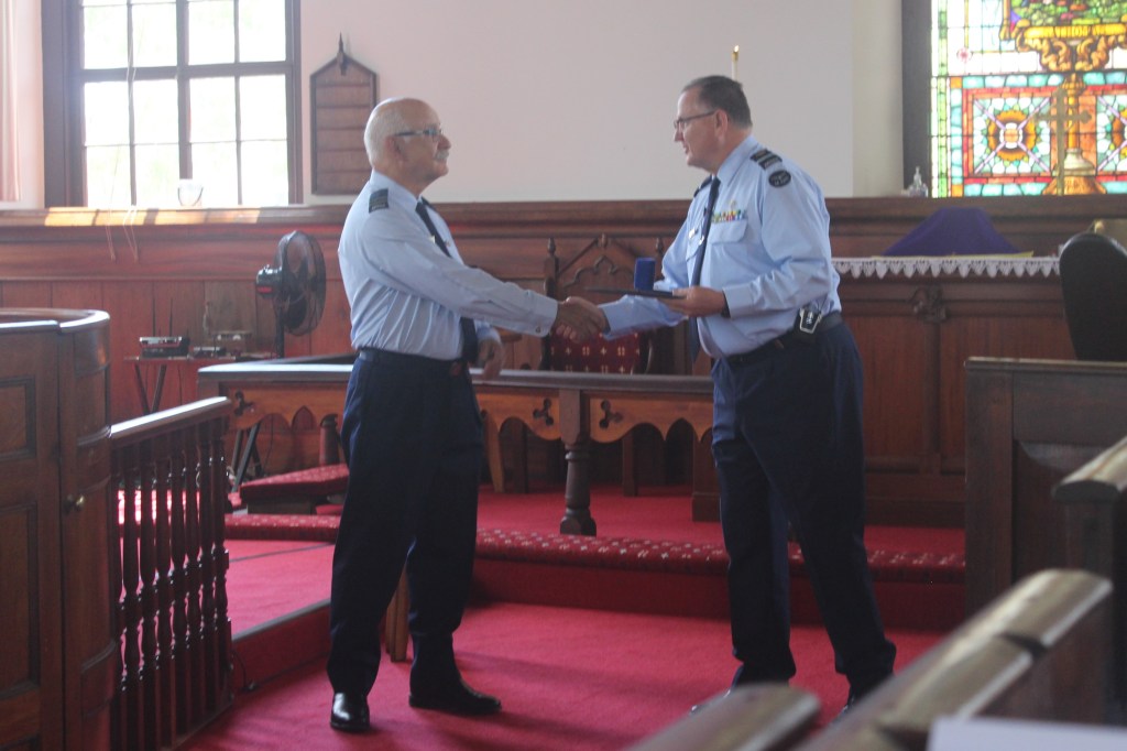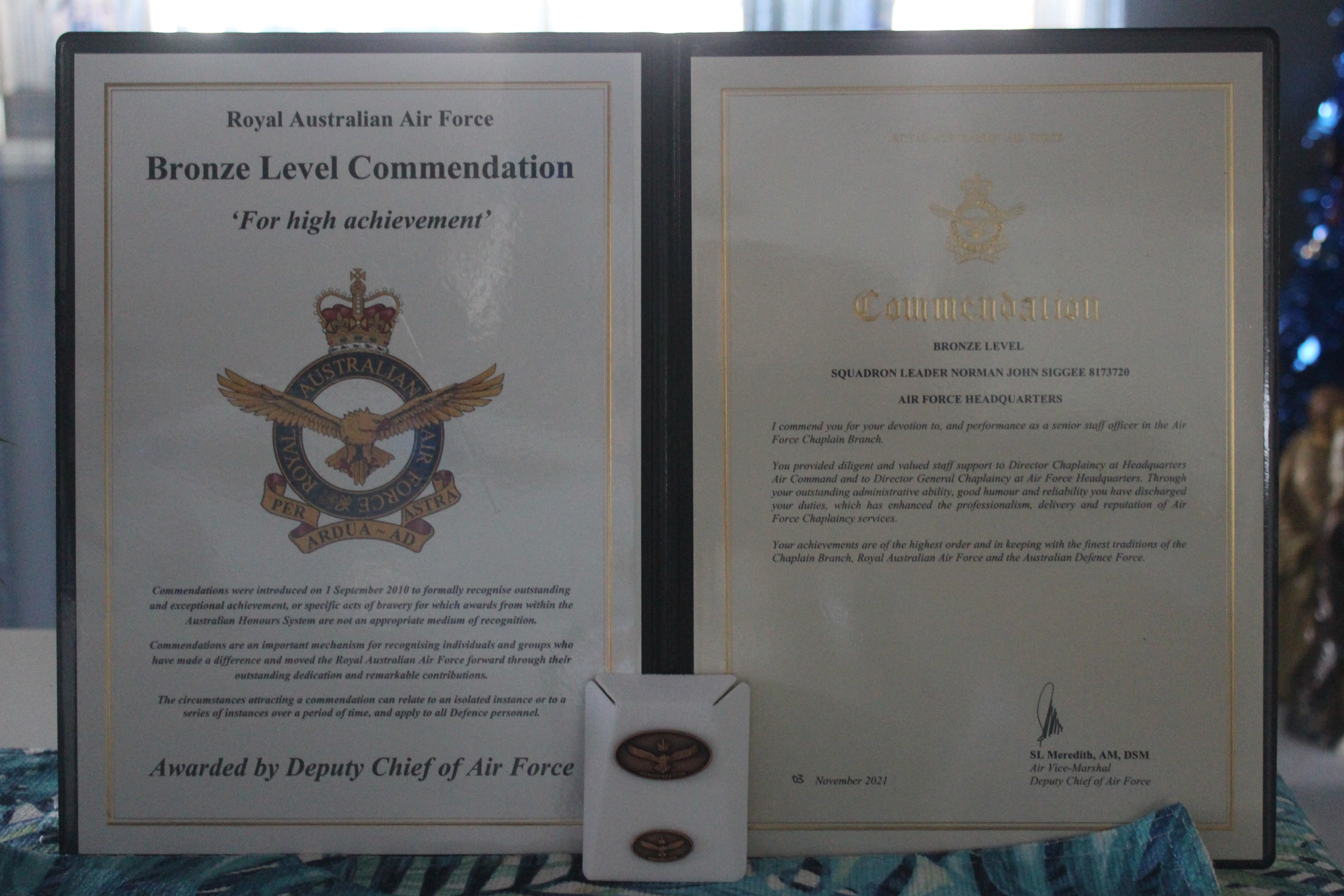 Squadron Leader Norm Siggee – 50 years of serviceAwarded by Deputy Chief of Air Force – S L Meredith Presented by Principal Air Chaplain Australian Air Force – Mark WillisProud of my man.