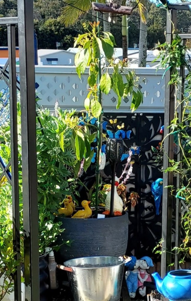 The avocado tree and two blueberry bushes are also in flower. This will be the first season both blueberry bushes to fruit at the same time. We have two pots of strawberries; one flowering. The other isn’t getting enough sun yet but it’s healthy. (neither shown in photos) As for the avocado – we’ll have to just wait and see. I think it’s just three years old and fruit usually appears on an avocado in five years.