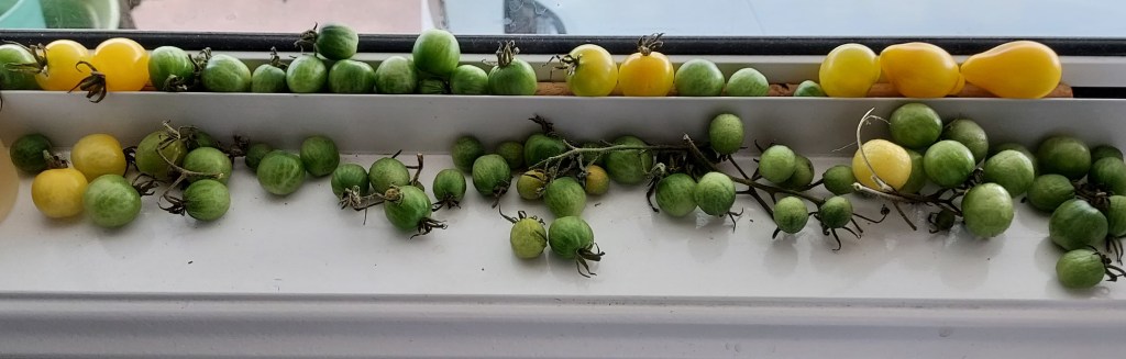 Little yellow tomatoes are always plentiful. There’s often so many of them that they fall to the ground in bunches. The kitchen window is just perfect for ripening of any fallen crop.