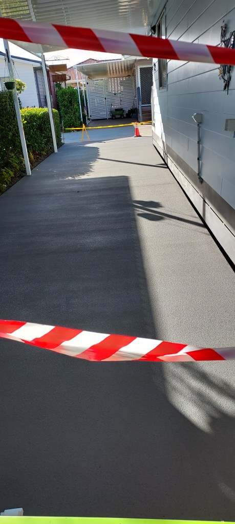 The second cement render took another day and a half before Jake the tradesman could walk on it to roll the first sealing coat. We decided on the roll-on instead of spray because of the close proximity of neighbours and also it would be 3 years before a reseal instead of 1 year with the spray.
