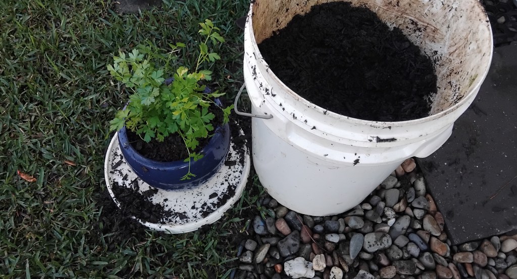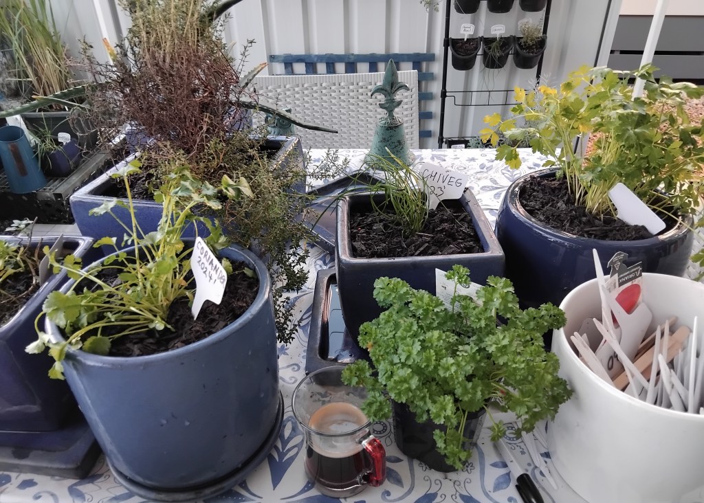 Finally the weather has been warm enough to get back into the garden. This weekend we cleaned up the potted herbs in the outdoor kitchen. I was surprised to see many of them still alive after the bleak winter. I re-potted some, trimmed others before removing the soggy muck that had accumulated along the fence.