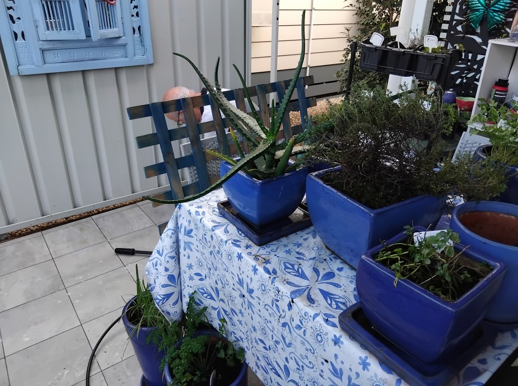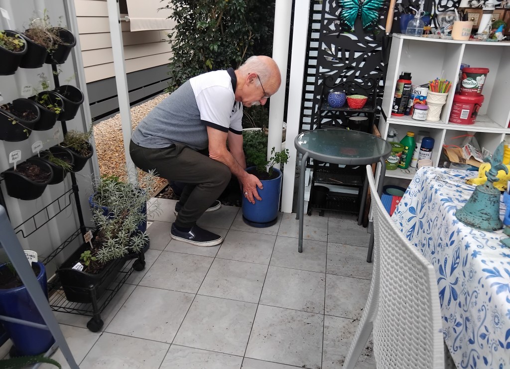 Once the area was clean and tidy, I put the pots back in place. Reminding Norm to bend his knees and mind his back, he kindly moved the heavier pots for me.
