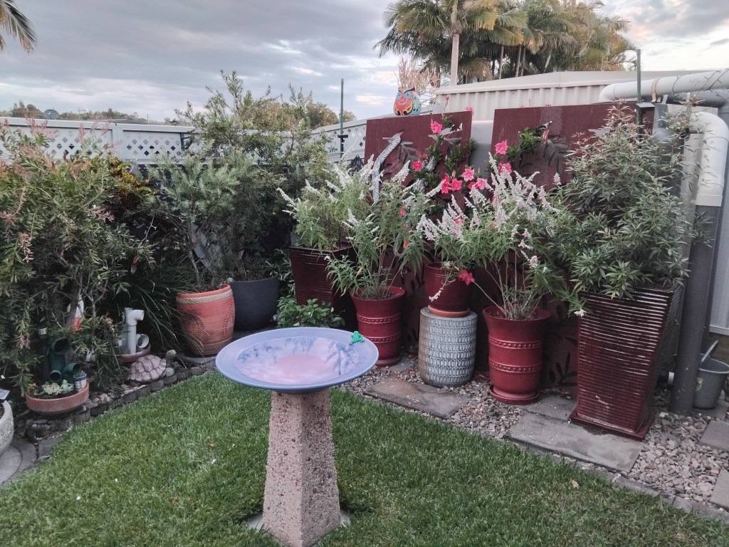 The sunset changed the colour of the water in the bird bath. Shades of pink painted the trees beyond the fence.