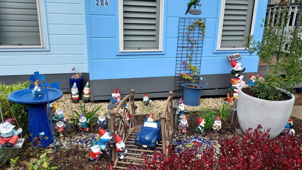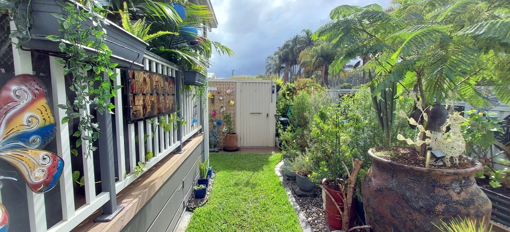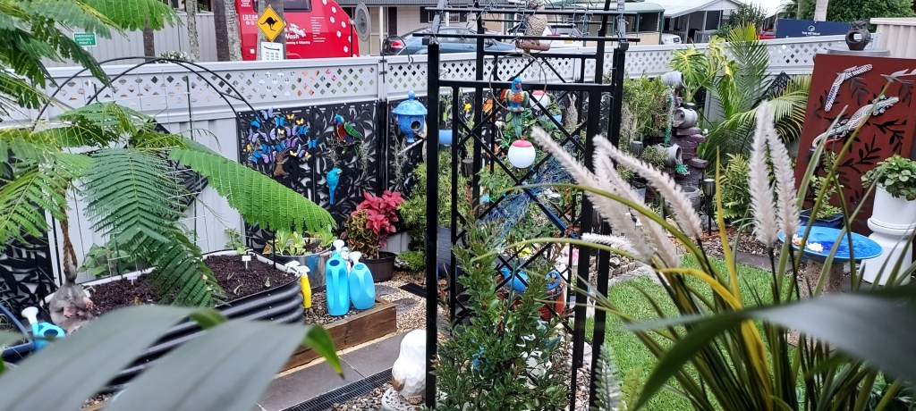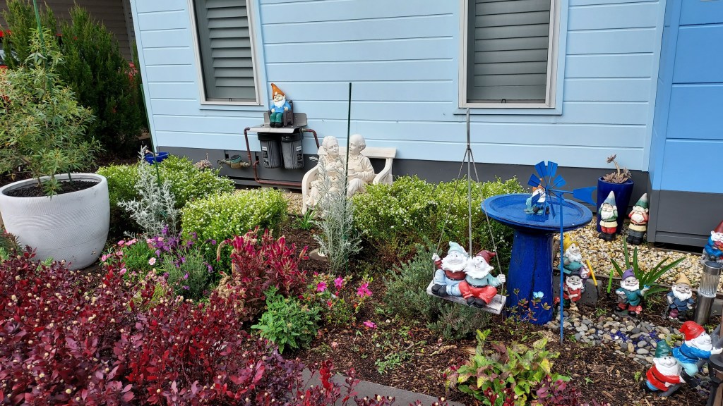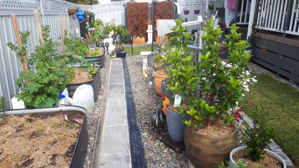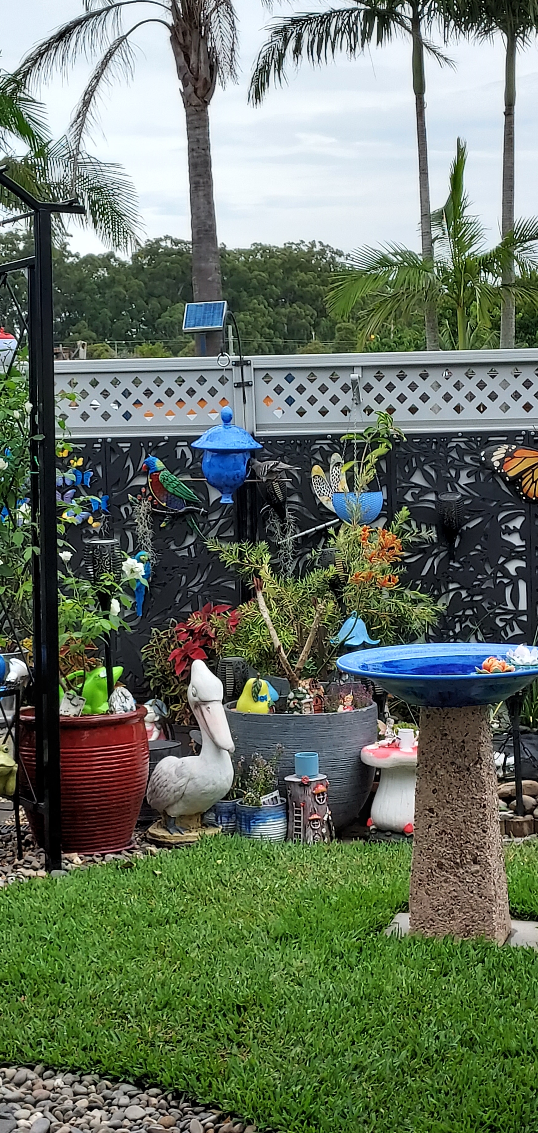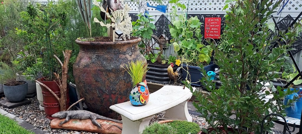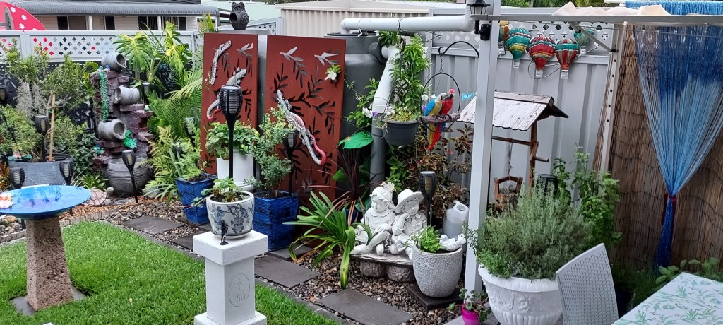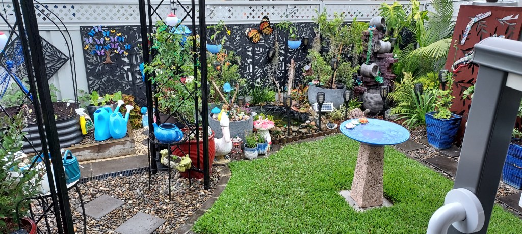 My dear neighbour and friend across the road kindly let me have her fairies, toadstools and gnomes that have been out grown by the grandchildren. “The Pond” has been overwhelmed by more fairies, little gnomes and fairy houses. One fairy has now become the centre piece of the birdbath which has inspired me to set aside a quiet day to sit and imagine before placing everything in different places. We have a young blue tongue lizard that roams my garden, and the neighbours, that bumps the poor little fairies into the pond. Some might say I’m a little crazy with my gnomes garden out the front, and now The Fairy Pond, but no one has yet disliked it. I think if I ever do get dementia, I’ll be happy in my garden. 🙂