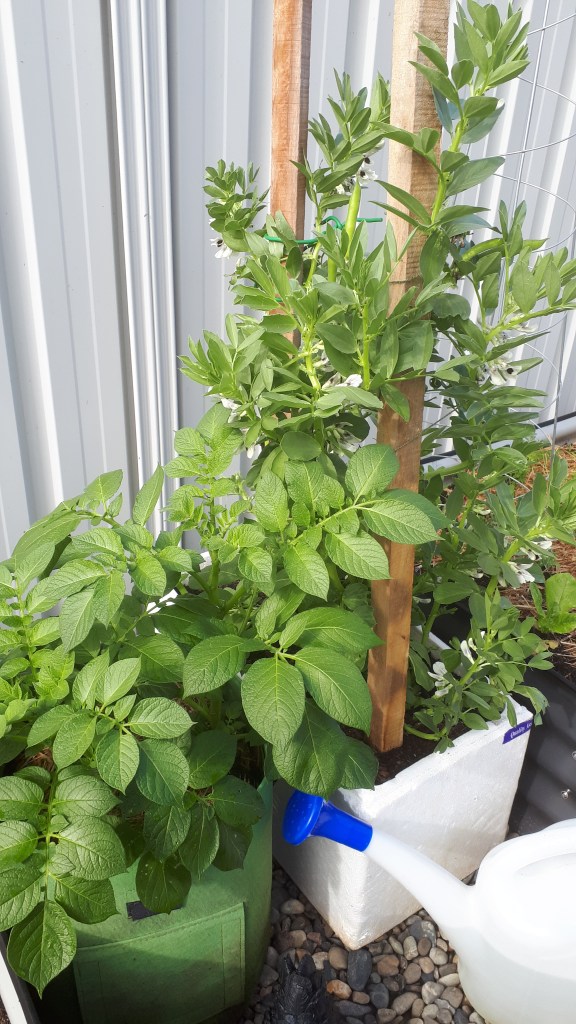 The brussel sprouts continue to thrive in their box and potatoes are growing well too.