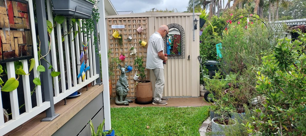 As suggested by one one my favourite bloggers, we set about looking for an outdoor mirror for the shed door. Norm finished fitting it today between heavy showers we have been experiencing on and of for two days.