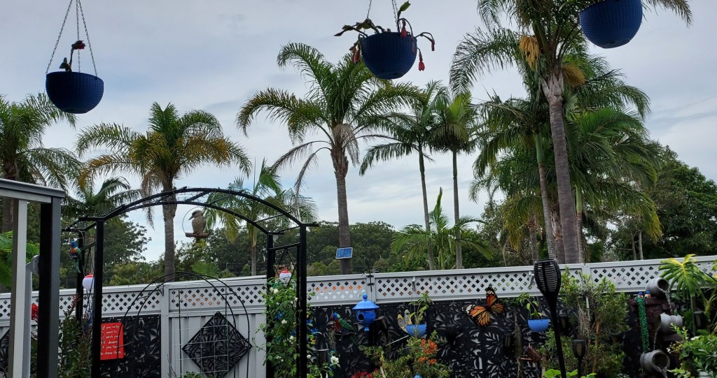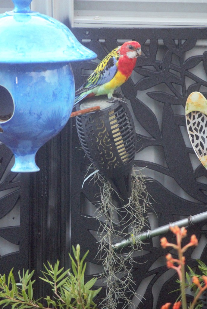 Seriously though, we have not witnessed so many birds in our garden since we began creating it in January 2020. We were so engrossed in the birds flocking to the top of the water tank that we didn’t notice the usual three or four on and in the blue bird feeder on the back fence until they flew off leaving the the bird feeder bouncing and shaking. There is one photo that was way to blurred for here that showed at least six birds in on and around the owl bird feeder. Like it was stacks on.